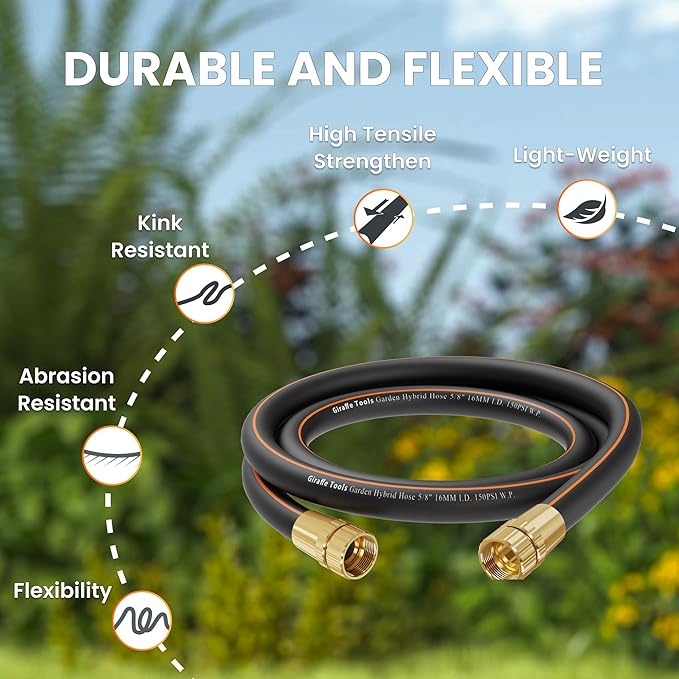 • 2FT Female Female Garden Hose: Combined with 2 layers of lightweight hybrid and 1 layer of bursting resistant polyester mesh, Giraffe Tools hose has been tested rigorously to confirm burst strength, kink and abrasion resistance, leakproof sea. It can be used as hose reel leader hose. The connector is 3/4 GHT, female to female connectings.