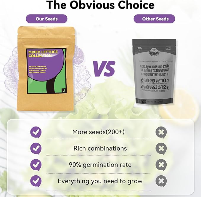 • Easy to Grow, High Germination: Our salad lettuce seed kits include easy-to-use growing guides. Additionally, our high quality lettuce herb seeds exceed 90% germination rate. Whether you're a starter or an experienced grower, we are committed to making growing lettuce simple and fun, so that you can enjoy the fun and harvest of growing