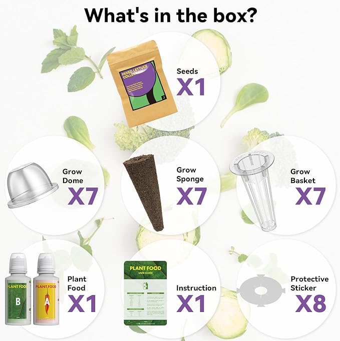 • Everything Your Need: inbloom salad lettuce seed kit not only includs American Fast Lettuce, Parris Island Lettuce, Butter lettuce, Red Romaine Lettuce, but includes 7 grow baskets, 7 sponges, 7 domes, 8 protective stickers, and A&B plant food. With our lettuce seed kits you'll have plenty of seeds to sustainably grow large quantities of lettuce