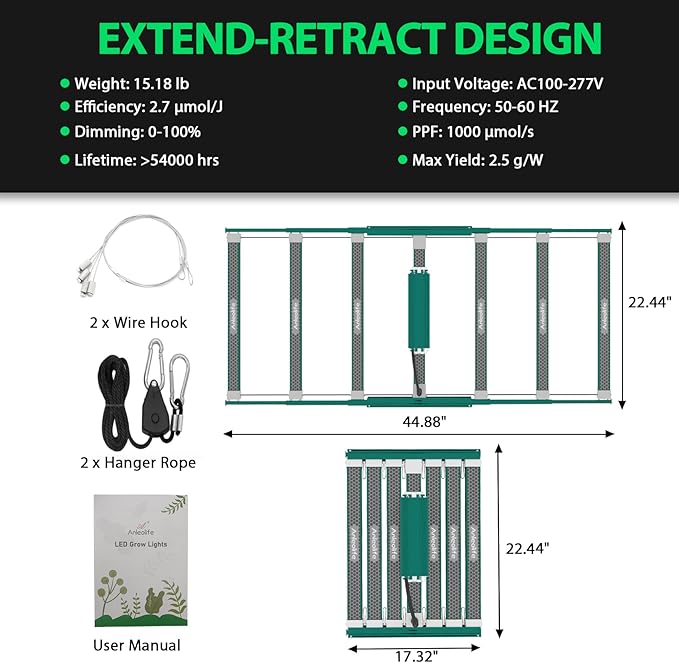 • Unique Extend-retract Design: Freely adjustable light bar spacing to suit different plant growth stages. Bar structure is lightweight, easy to install, plug and play