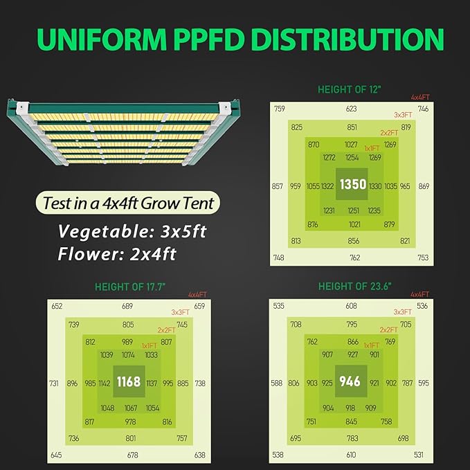• High Efficiency & High Yeild: 1050pcs LM301H EVO and LM281B+Pro LEDs, market-leading 2.7 µmol/J PPE, Max yield 2.5 g/W, achieving an impressive PPFD 1350 μmol/m²/s at 3x5ft core coverage. Compared with other similar lamps, the yield is increased by 20%, the average PPFD is increased by 20%, and the energy consumption is reduced by 10%