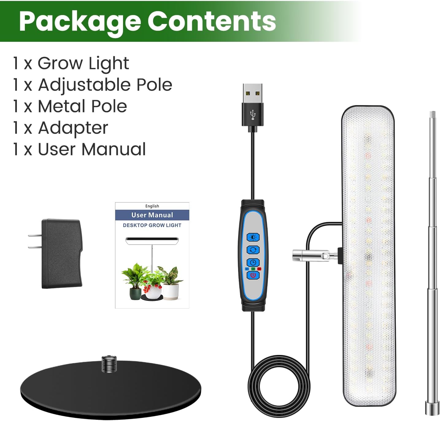 • Upgraded Desk Grow Light: This grow lamp is equipped with PC cover, and a protective sleeve is welded to the lamp board interface. Not only is it dustproof, it also provides safe lighting protection. 5.2 inch metal base and anti-slip pads ensure stability.