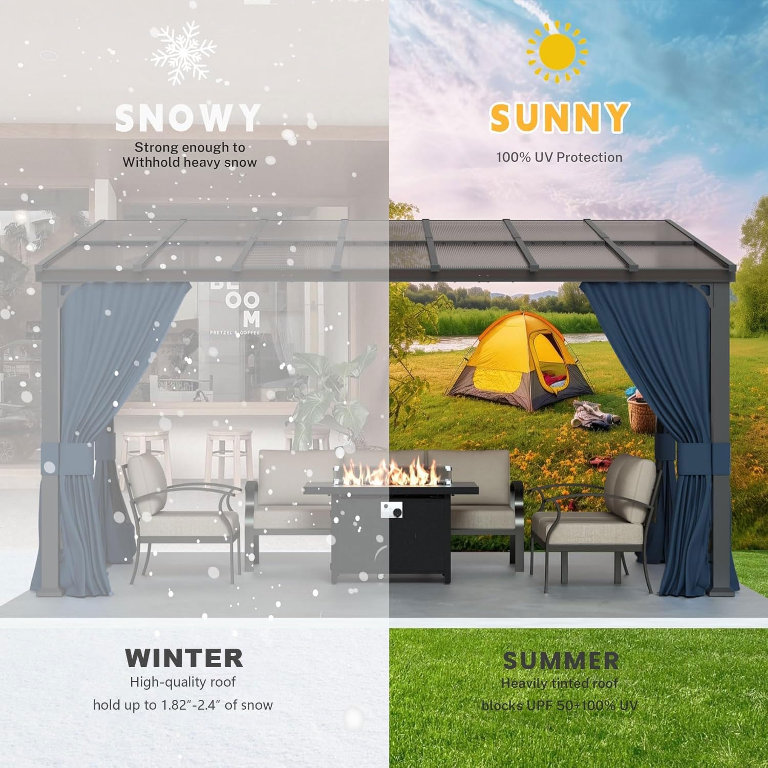• USAGE SCENARIOS: Gazebo is very large and can accommodate multiple people. You can also place an outdoor furniture set underneath the gazebo. Wall mount heavy hardtop gazebo is suitable for installation on the side of the house, under the eaves, along the porch, in the patio, and is suitable for use next to a wall. Outdoor pergola can be used to host a variety of parties.