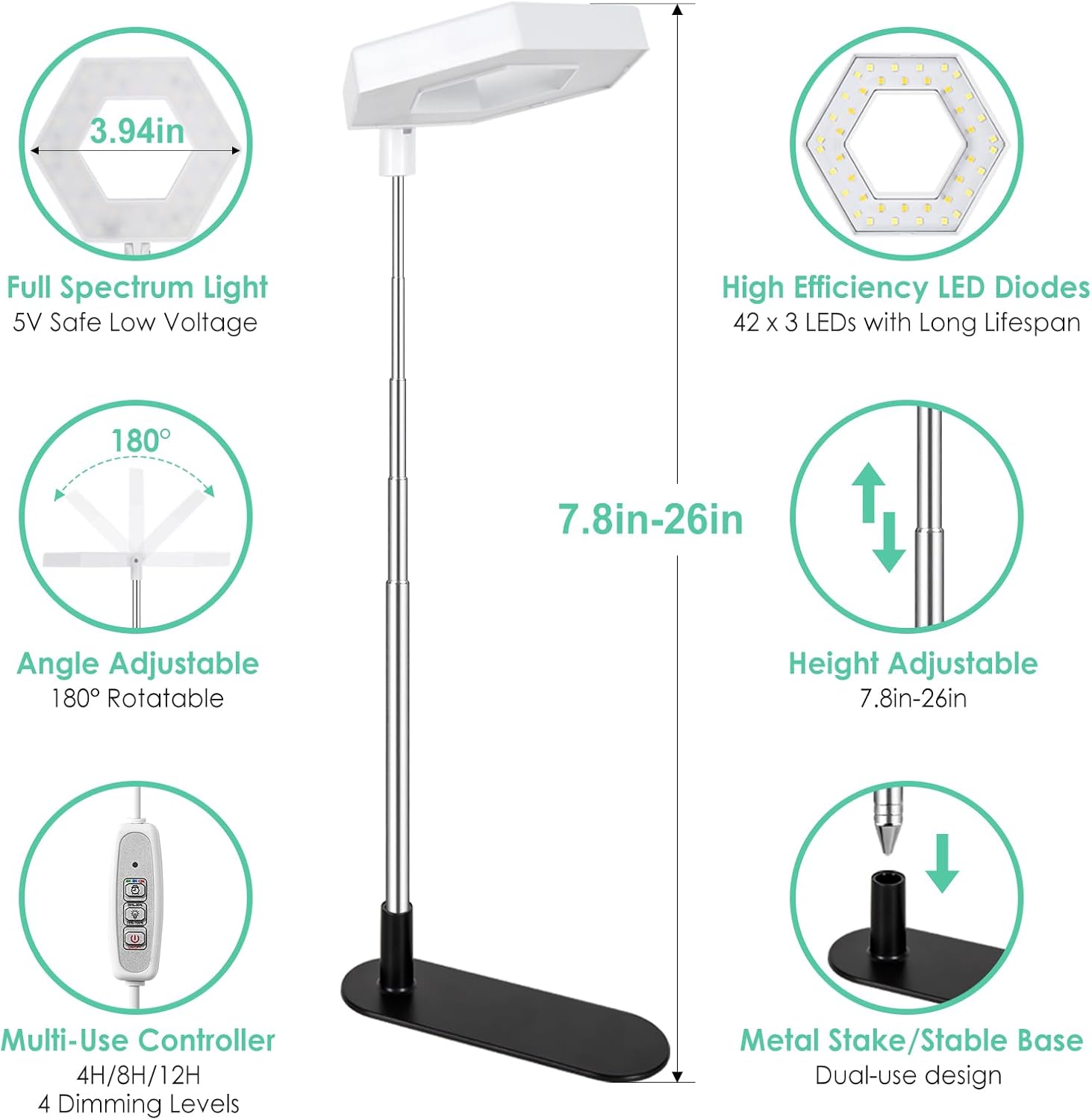 • Brighter Plant Lights with 4 Dimmable Levels and Height Adjustable: Our grow lights for indoor plants use more new technology LED diodes to make them brighter and more efficient. It also has 4 dimming levels (25%, 50%, 75%, 100%) to adapt to different stages of plant growth without worrying about burning the plant.With an adjustable telescopic rod, you can easily adjust its height from 7.8 "to 26" for optimal lighting for plants.