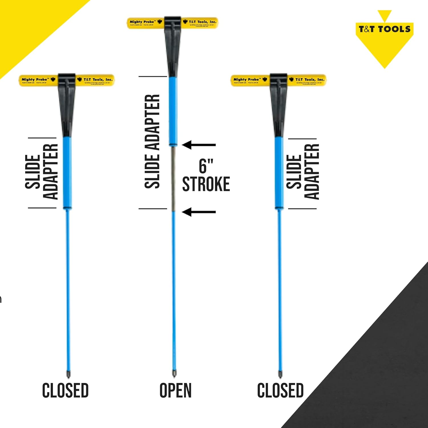 • SLIDE ADAPTER WITH EXTENDED LENGTH: The slide adapter provides a 6-inch stroke, allowing to pound into and out of the ground. With its 6-inch stroke, the slide adapter enhances the Mighty Probe's ability to break through hard ground. Note: the slide adapter adds 8 inches to the overall length of the probe, making it 50-inches overall.