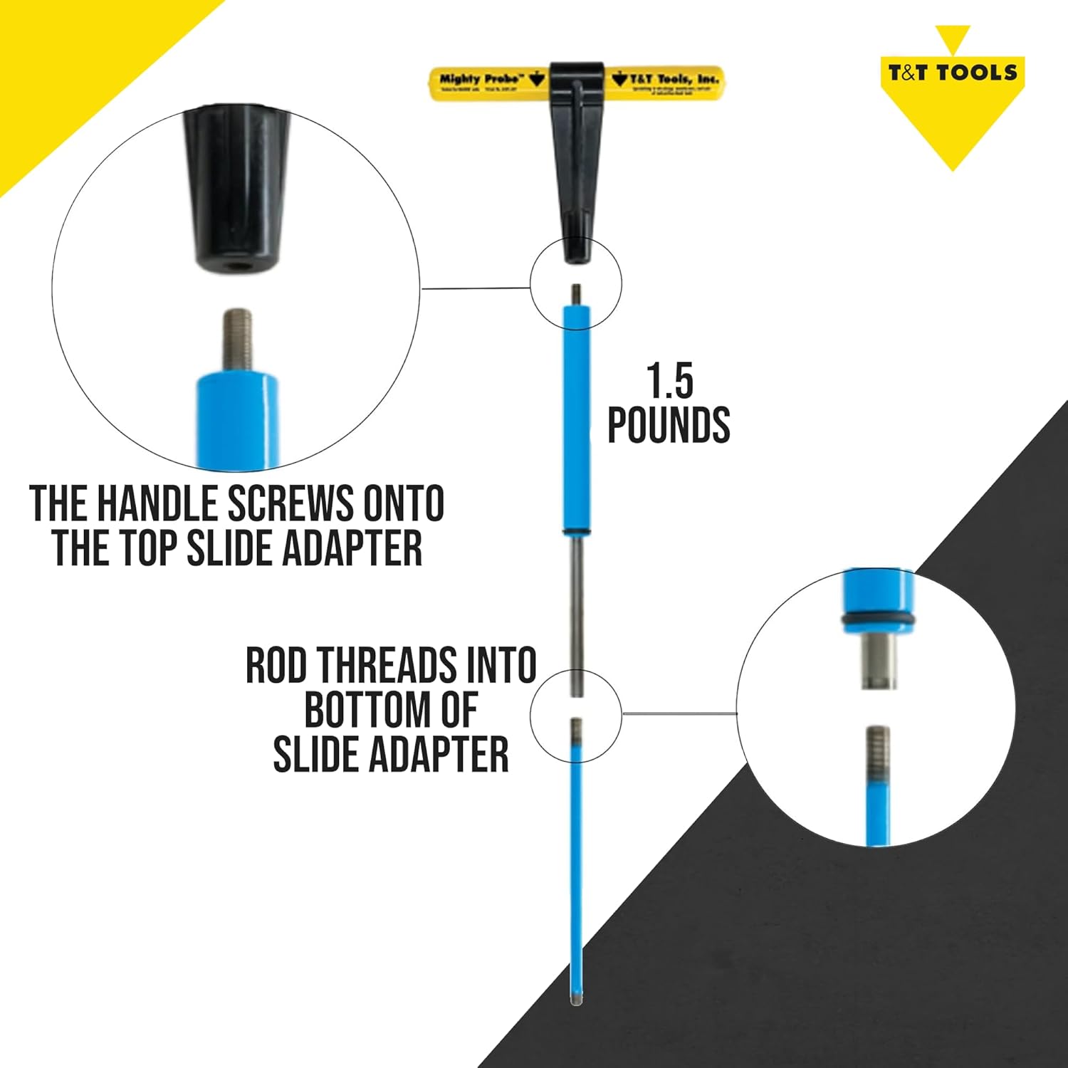 T&T Tools Mighty Probe with Slide Adapter – Insulated Metal Soil Probe, Ground Probe Rod with T-Handle, Septic Tank Locator Soil Sampling & Compaction Tester - 50 Inch Length, 3/8" Round Rod