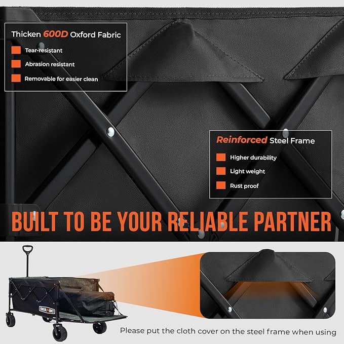 - ใHigh-Quality MaterialใThis utility collapsible wagon is crafted with 600D thickened Oxford cloth, ensuring both waterproof and tear-resistant properties. Its excellent wear resistance extends the service life, while the removable and washable bag adds convenience, eliminating worries about dirt.