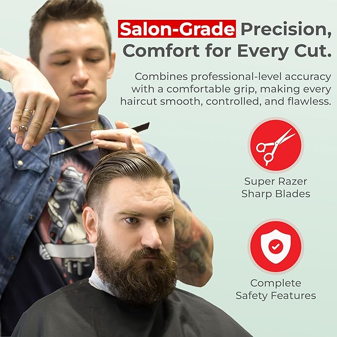 - โ๏ธ ALL-IN-ONE HAIR SCISSORS: These hair trimming scissors for hair cutting are designed for professionals (barbers & hairstylists). Designed to handle all hair textures, from thick to coarse strands or delicate, silky locks with equal ease. whether you're shaping bouncy curls or trimming split ends, shaping bangs or adding layers to long lengths, or defining sideburns. These featherlight and easy-on-hand hair cutting scissors professional are perfect for men, women, teenagers, seniors, and even kids โ anyone who needs a haircut!