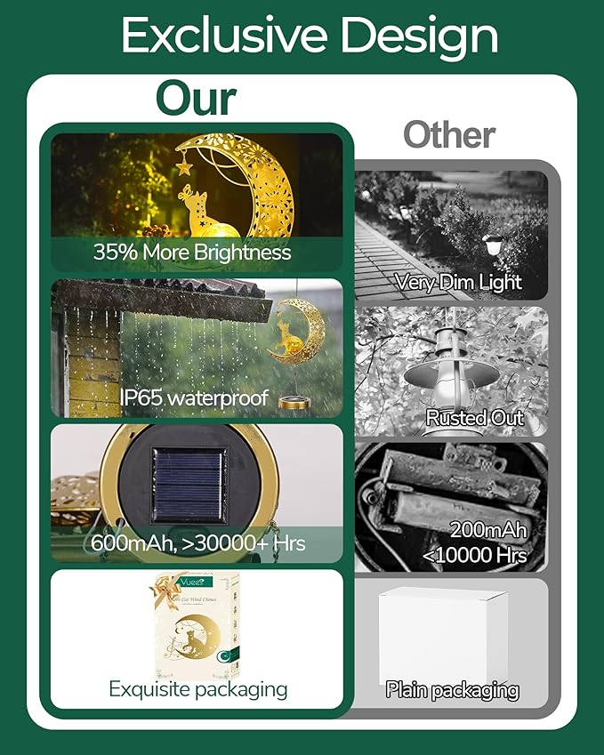 • WINDY WHISPERS, MOONLIT NIGHTS: Soothing deep tones chime with a glowing moon, creating a magical outdoor ambiance. Delight cat lovers and nature enthusiasts with a unique solar-powered wind chime. Enjoy lasting beauty and relaxation with this cat wind chime.