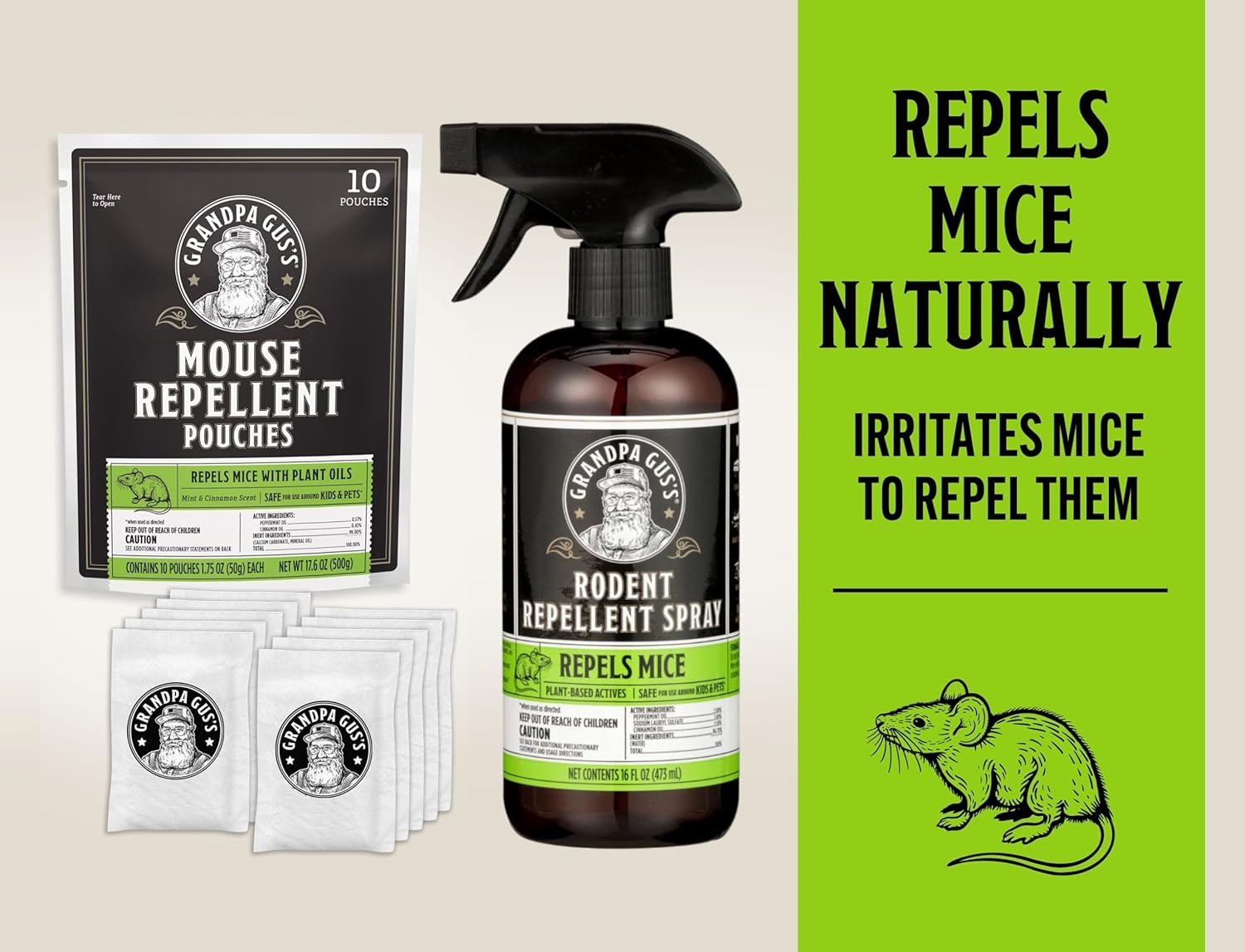 Grandpa Gus's Natural Mouse Repellent Pouches (10 Pack) Bundled with Rodent Repellent Spray (16 fl oz), Peppermint & Cinnamon Oils, Repel Mice/Rats from Home, Shop, Cabin, Shed, RV, Car & Boat Storage