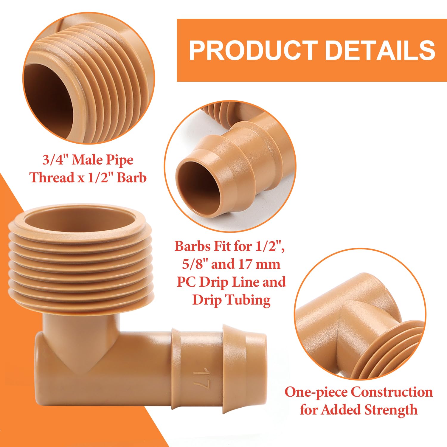 • 3/4" Male Pipe Thread (MPT) x 1/2" Barb: The package includes 12 pieces of 3/4 inch male thread-to-hose adapter. This unique PVC adapter allows for quick and easy connection of 1/2" drip irrigation tubing to any 3/4" female pipe threaded water source or device.