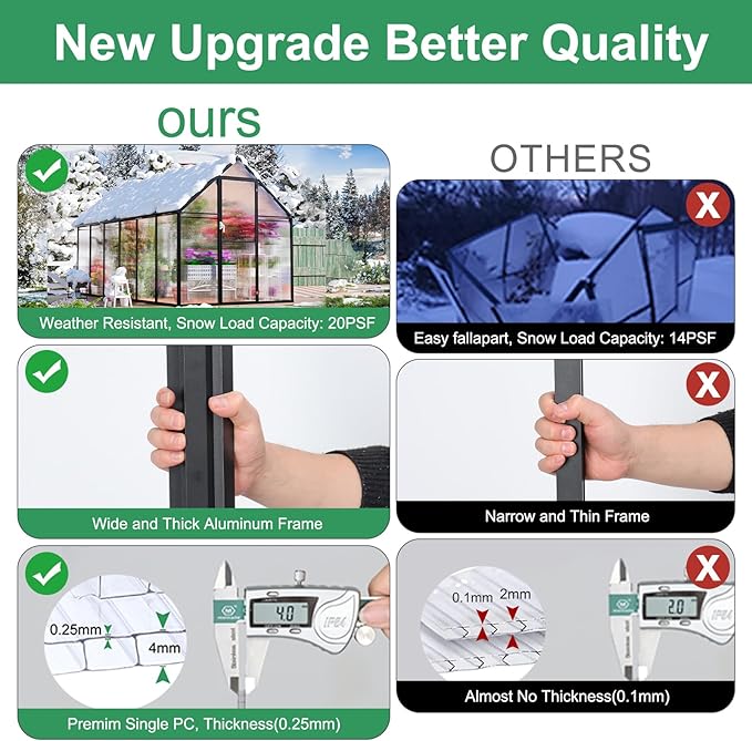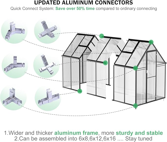 • ๐ŸŒปSturdy Frame: Our greenhouse kit boasts a robust rust-resistant aluminum frame designed to withstand various weather conditions. 2 skilled enthusiasts can assemble this greenhouse kit within just 4-6 hours. Introducing patented technology, Easy assembly, saving you 50% of your time. Gone are the days of tedious setups. With a simple push and locking screw, our Quick Connect ensures a reliable, secure, and swift link-up. It can also support snow loads of up to 20PSF.