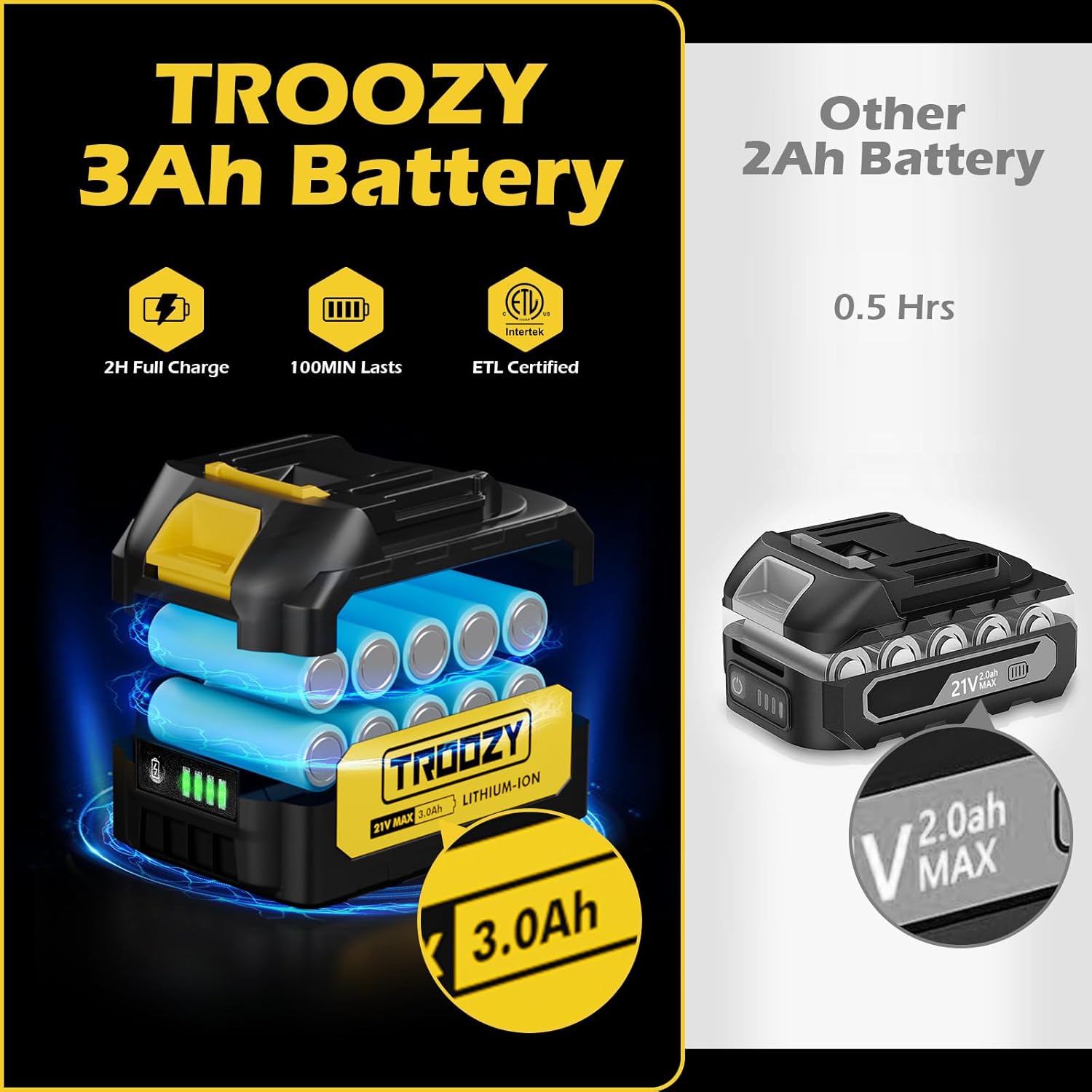 • 【100Mins LASTS BATTERY】Comes with 1*3000mAh FCC certified battery which provides up to 100mins of battery life, lasts twice as long as a regular 2Ah. So outdoor work will never be interrupted by a dead battery again.