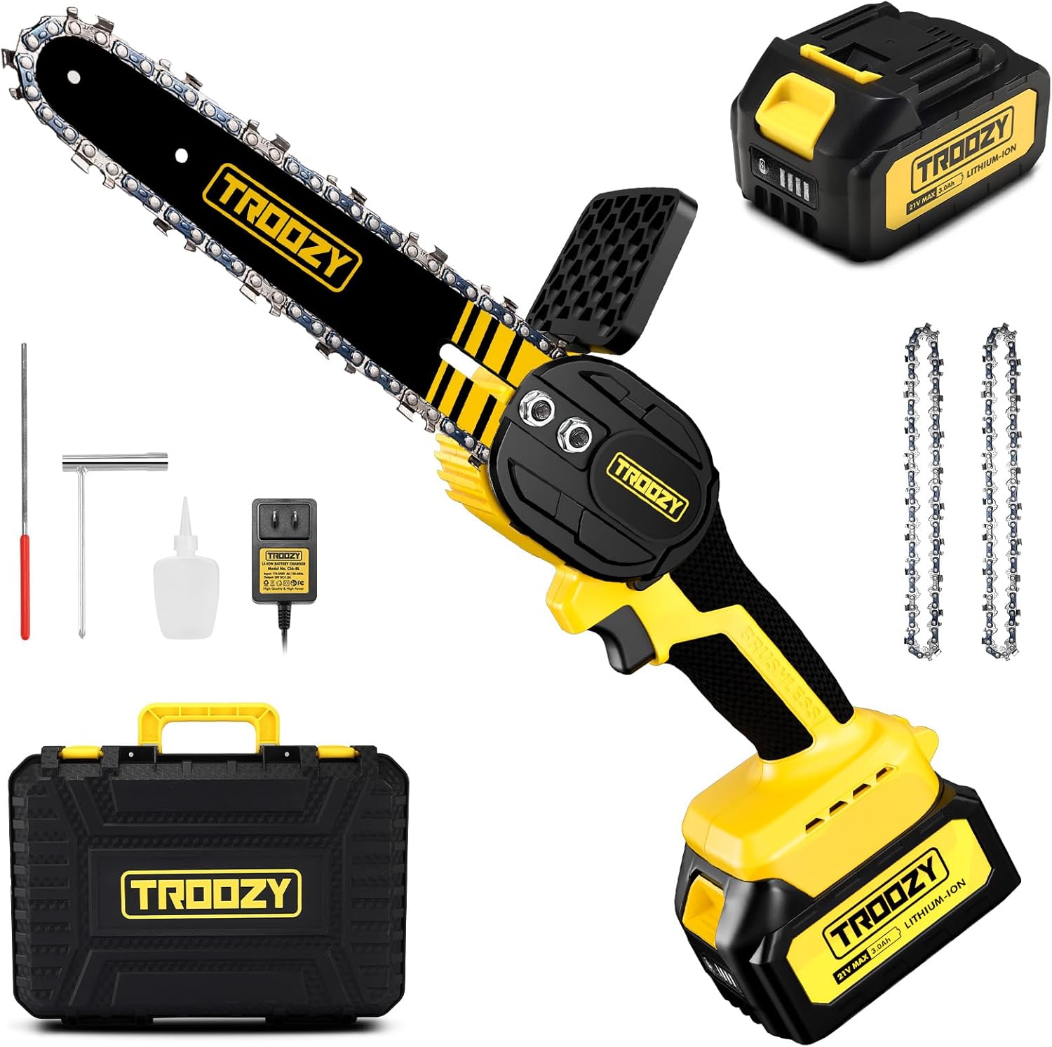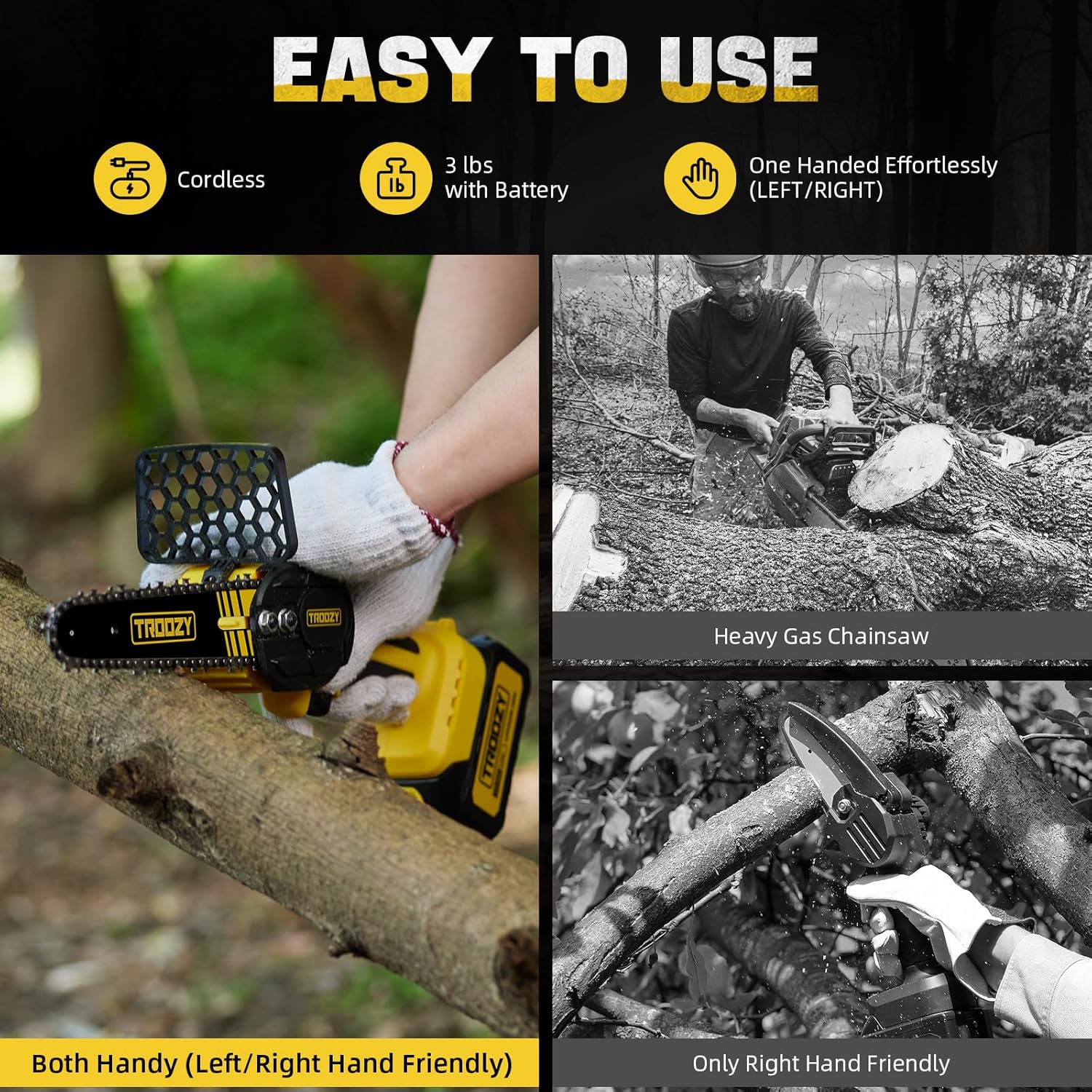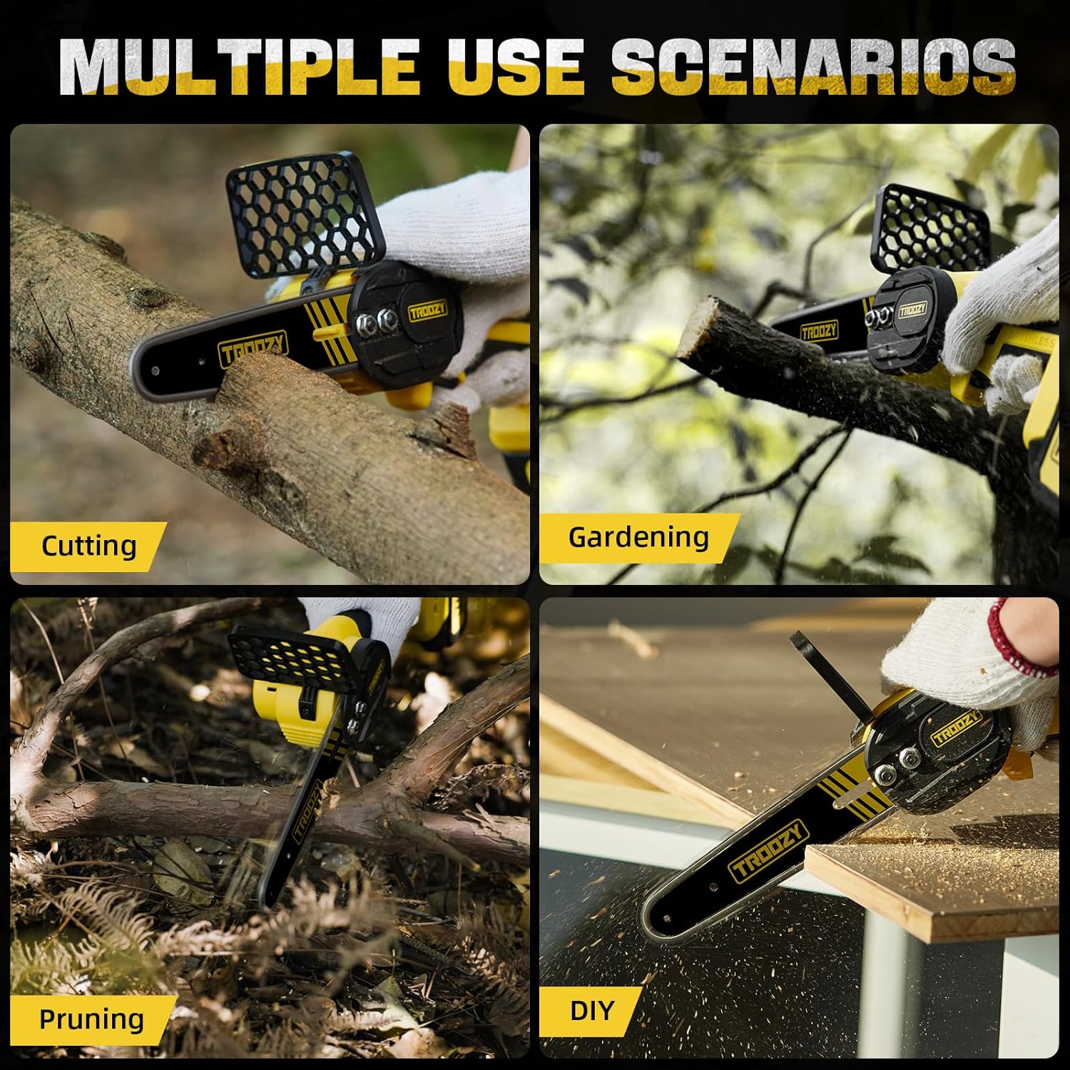 • 【POWERFUL AS MONSTER】: 3.0 brushless motor brings a chain speed of 26.5ft/s, cutting a 6" tree in just 7s. 150% more cutting power than pure copper motors, while energy consumption is reduced by 70%, making troozy chainsaws lasts twice as long as others