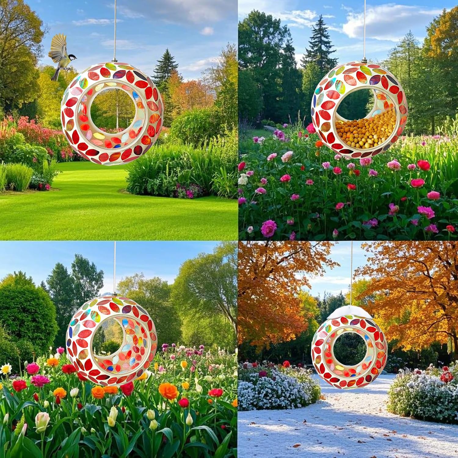 • Mosaic Material: This round mosaic bird feeder with a hanging wire so you can easily hang the feeder outside to brighten up your backyard, patio, lawn, deck. It catches sunlight as it gently spins and sparkles