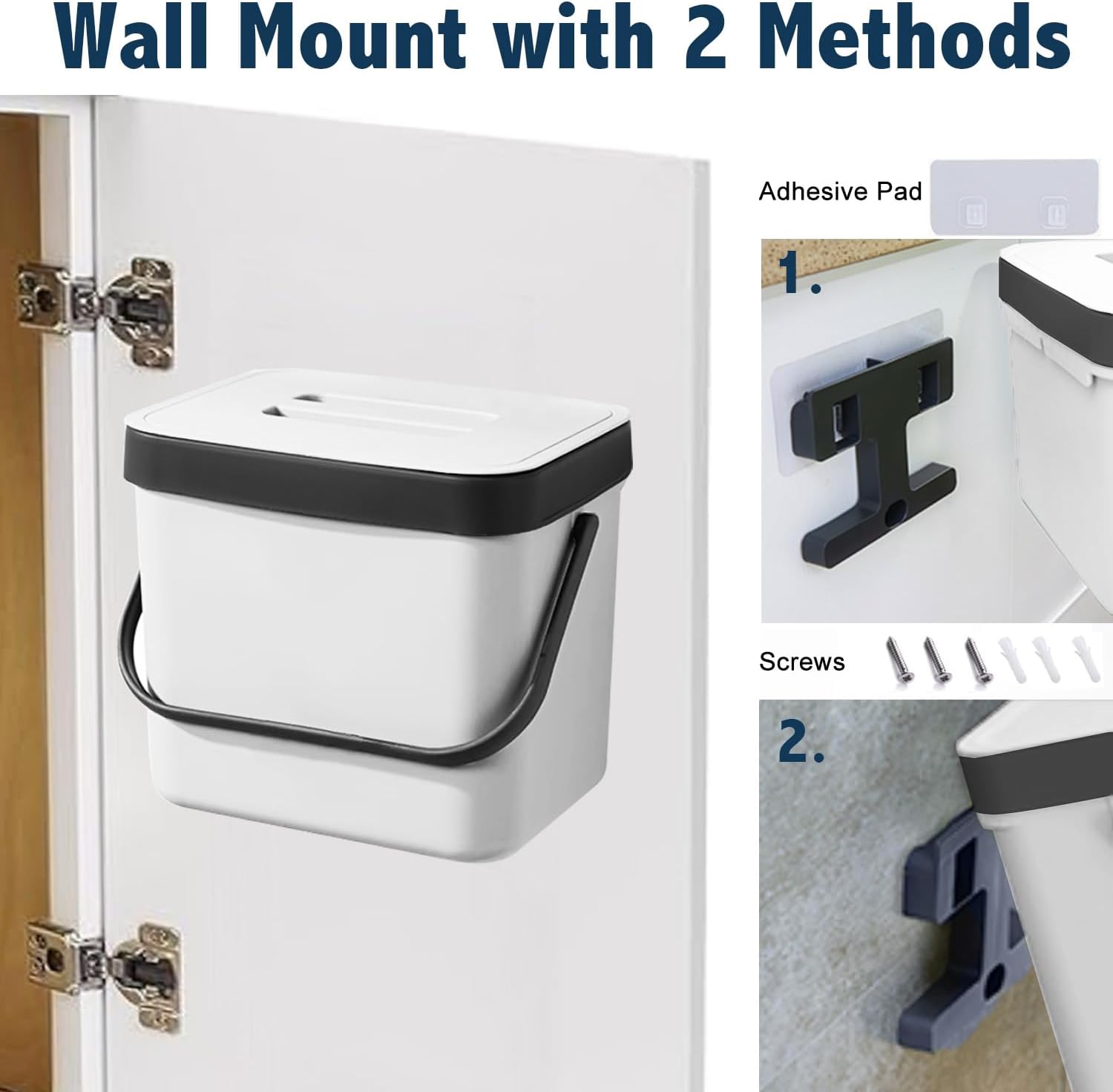 • Wall Mount/Under Sink/Hanging Grabage Can: The small compost bin can be easily hung on kitchen cabinet doors, pantry doors. (The thickness of the door should be less than 0.86 inch) Moreover, this small plastic garbage can also be wall-mounted to under sinks, cupboard, kitchen wall with adhesive pad or screws.