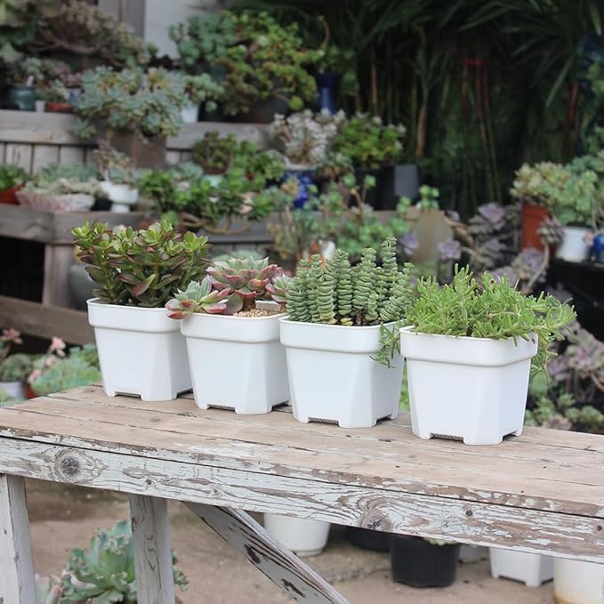 • Package includes 20pcs white square plastic seedling pots. Pot size in 4.75”W (top) x 3.75"W (base) x 4.25”H, ** no saucers and plants included **