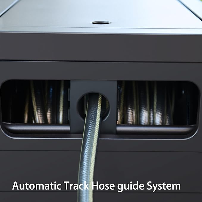 • [Automatic Track Hose guide System]: The hose guide at the front of Water hose reel guides hose evenly as you rewind, kick away all of kink trouble. Keeps your hands clean and free.