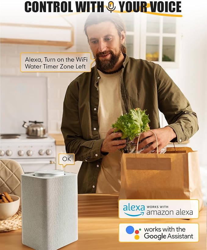 • Flexible Manual Watering:The manual watering time for each zone can be set from 1~59 minutes, and you can enable manual watering for the left/right/two zones via the APP, the button on the water timer, or voice commands to Alexa/Google Assistant.