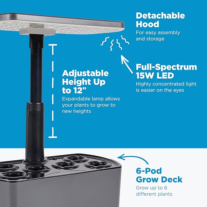 • ROOM FOR 6 PLANTS: This countertop garden features an optimized grow deck so you can grow 6 different vegetables, herbs, and flower, all up to 12 inches tall
