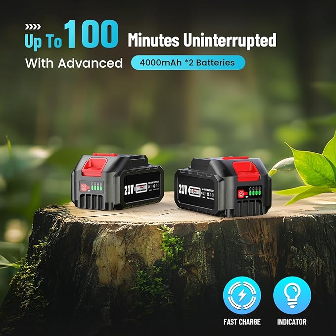 - Work Longer, Power Smarter: With two 4000mAh batteries, you’re always ready to go. Enjoy 60–80 minutes of non-stop performance—cut, trim, and shape without losing momentum. While one battery fuels your project, the other stands by. You’re in control from start to finish