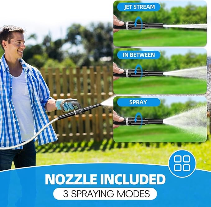 • Upgraded Independent Grip: The nozzle consists of 3 spray modes: jet stream, spray, and in between. The thumb can control the size of the water flow, making it more convenient to use. Individual grips with non-fatigue design and ergonomics for easy use in multiple applications such as plant watering, car washing, pet showers, yard cleaning, garden irrigation, RV, or as a gift