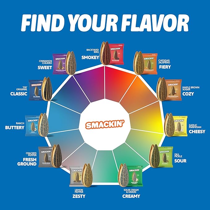 • GET SMACKIN': The classic sunflower seed reimagined with bold flavors, jumbo sunflower seeds and no more salty burn. Every small-batch of hand crafter sunflower seeds is coated in gourmet seasoning and finished with a signature roast.