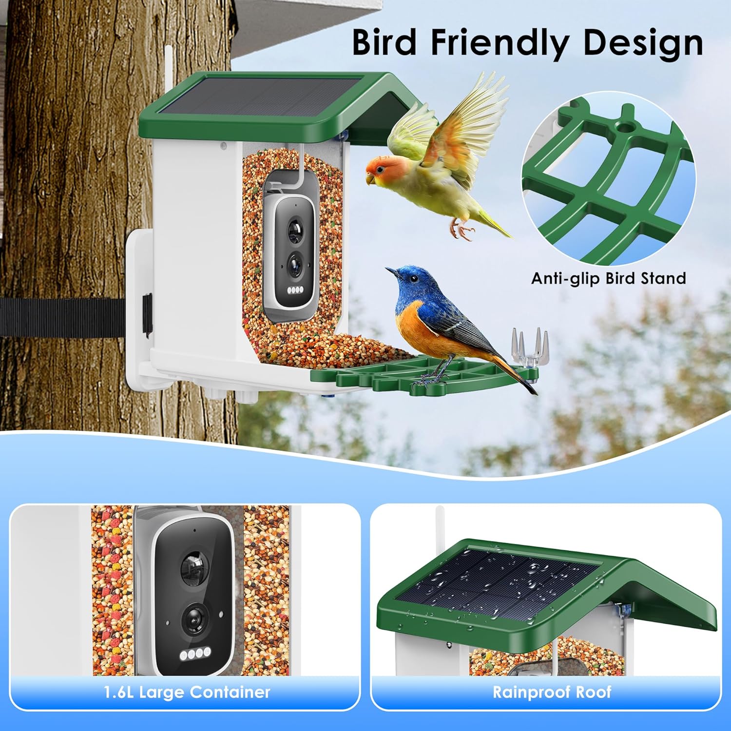 Smart Bird Feeder with 2.5K HD Camera – AI Bird Species Recognition, Solar-Powered, Live Alerts & Video Capture, Squirrel-Proof Outdoor Birdhouse, Gift for Nature Lovers