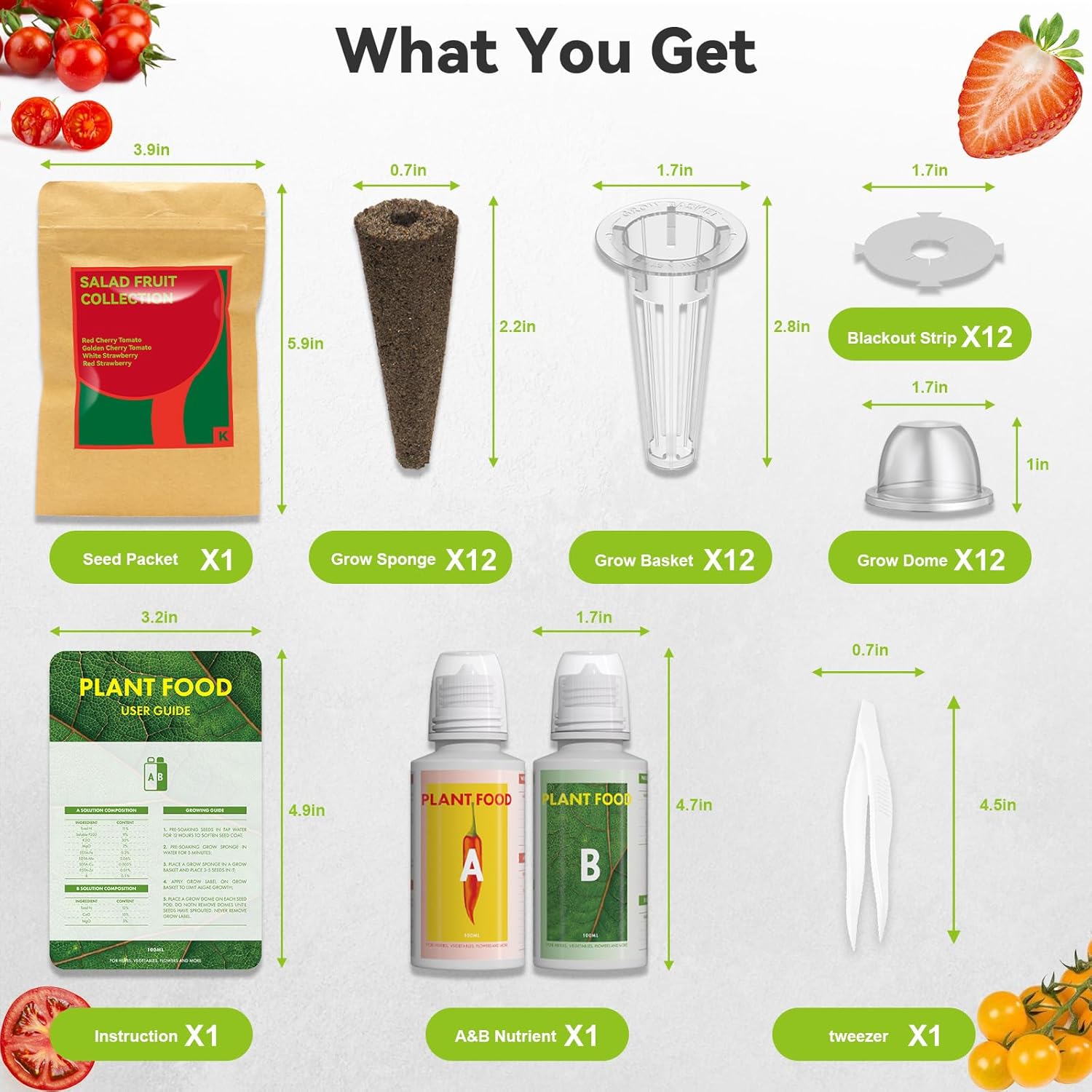 • All-in-One Hydroponic Growing Kit: Includes everything you need to grow fresh strawberries and tomatoes at home, with no soil required—perfect for beginners and gardening enthusiasts alike