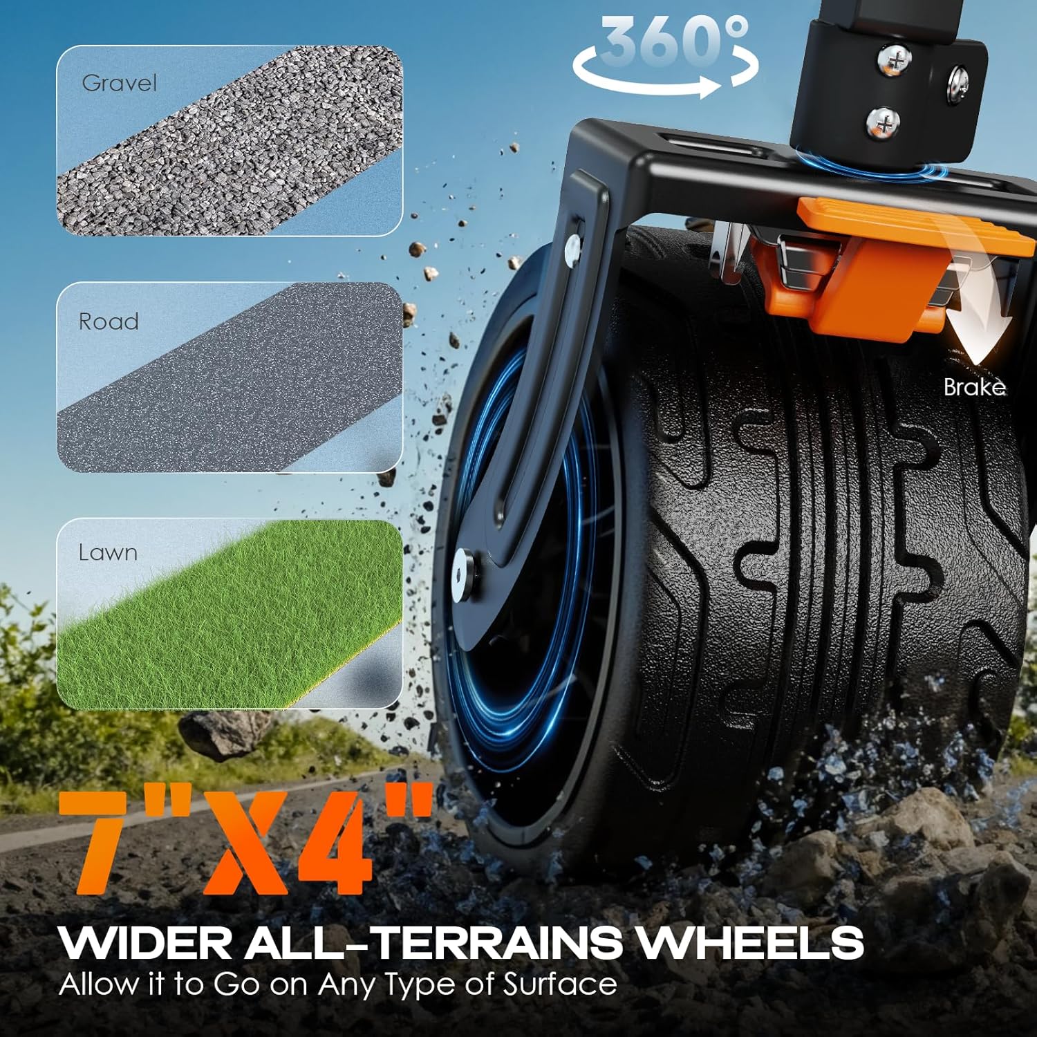 • LOCKING BRAKE DESIGN : The front wheels are equipped with brakes, which locks both the wheels and direction simultaneously effectively to stop and prevent the wagon from moving. Navatiee collapsible wagon features four 7"x4" PVC all-terrain wheels built to handle hard sand, grass, and all kinds of complex ground. It features strong abrasion resistance, silent shock absorbance, wear proof, no drag marks and enhances the impact resistance of the wheels.
