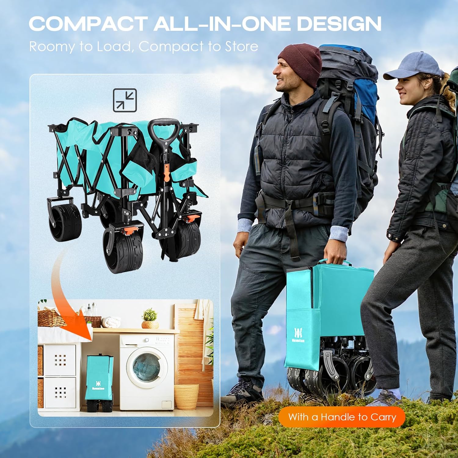 • COMPACT DESIGN FOR EASIER STORAGE : We adopt the unique and innovative fold-flat design to easily fold or unfold in a few seconds without any tools, weighing only 23 pounds, folding size: 13.8" x 9.5" x 21.7". Navatiee collapsible wagon cart is convenient for carrying or easy storage in a car's trunk, in a closet, storage rooms or garages. It comes with a built-in handle and is convenient to take anywhere you need.
