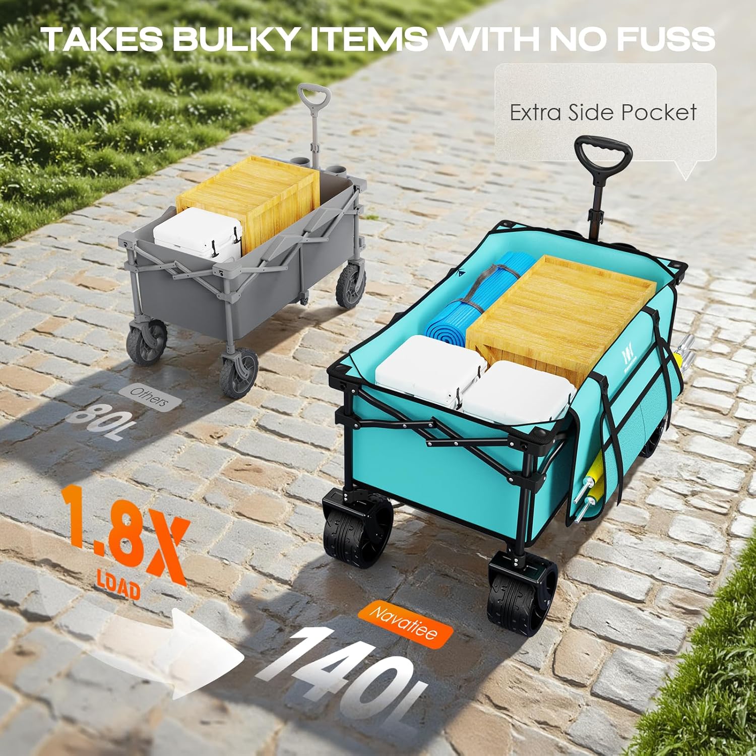 Navatiee Big Wheels Collapsible Wagon Cart Foldable, Heavy Duty Beach Wagon with Silent All-Terrain Wheels, Folding Utility Grocery Cart with Side Pocket and Brakes for Camping Garden Sports, Blue