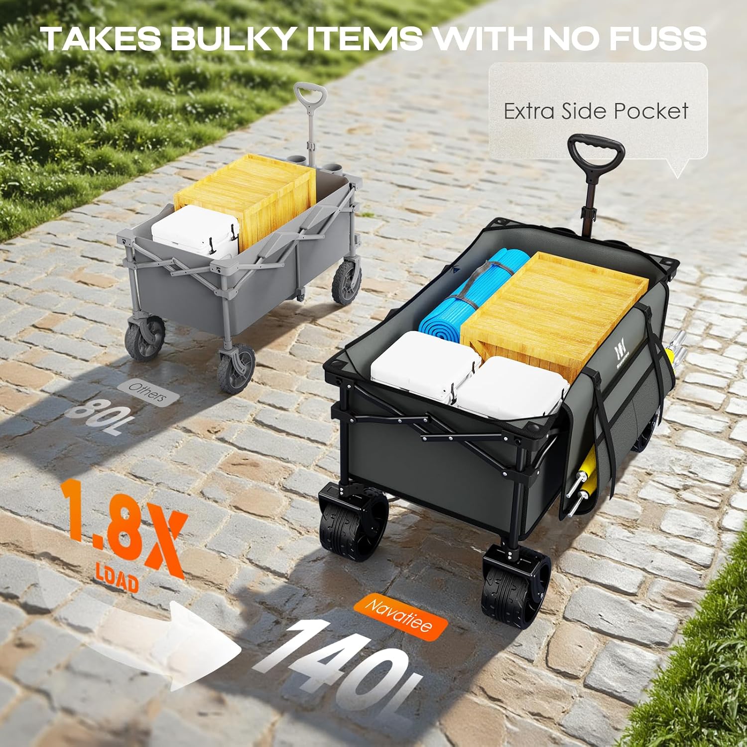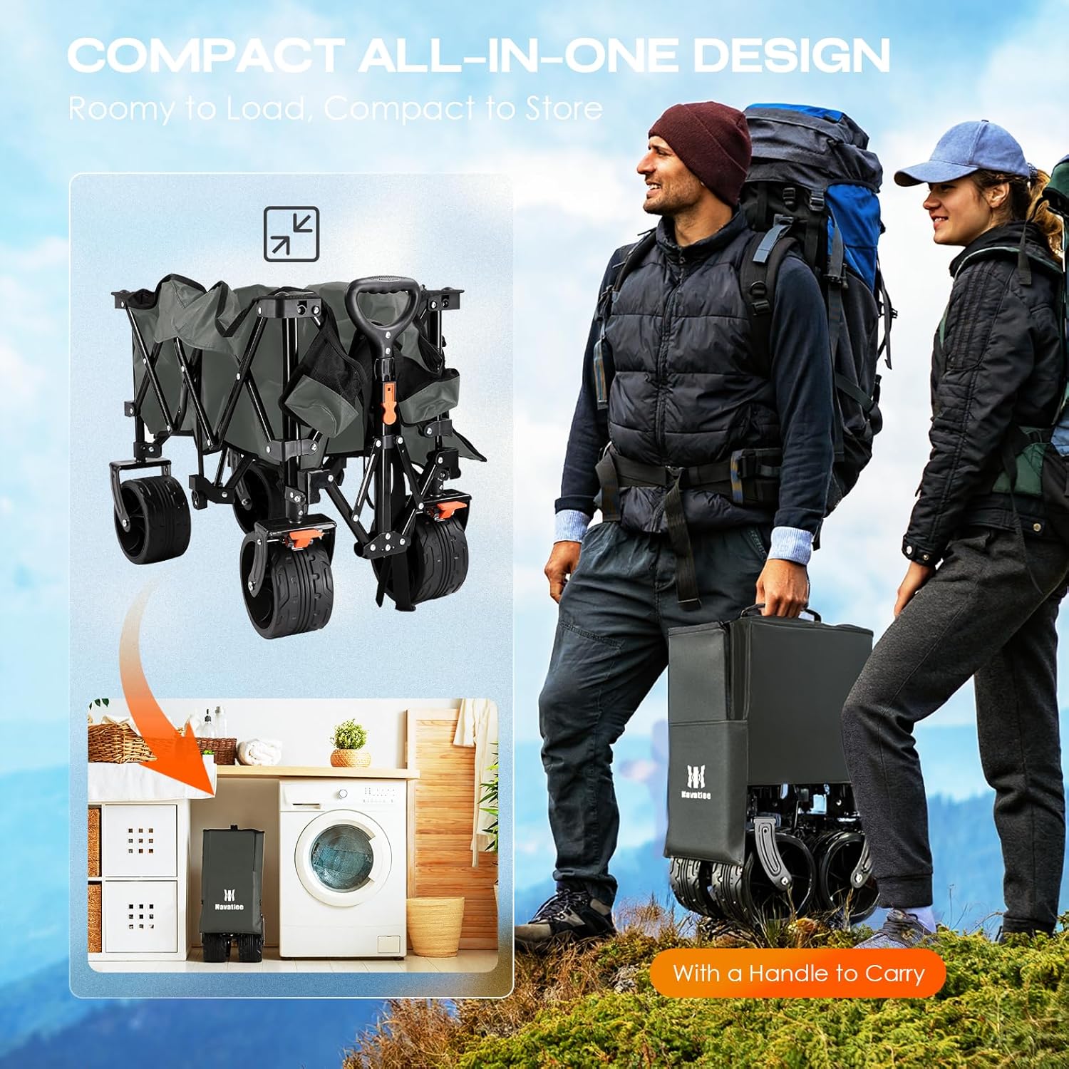 • COMPACT DESIGN FOR EASIER STORAGE : We adopt the unique and innovative fold-flat design to easily fold or unfold in a few seconds without any tools, weighing only 23 pounds, folding size: 13.8" x 9.5" x 21.7". Navatiee collapsible wagon cart is convenient for carrying or easy storage in a car's trunk, in a closet, storage rooms or garages. It comes with a built-in handle and is convenient to take anywhere you need.