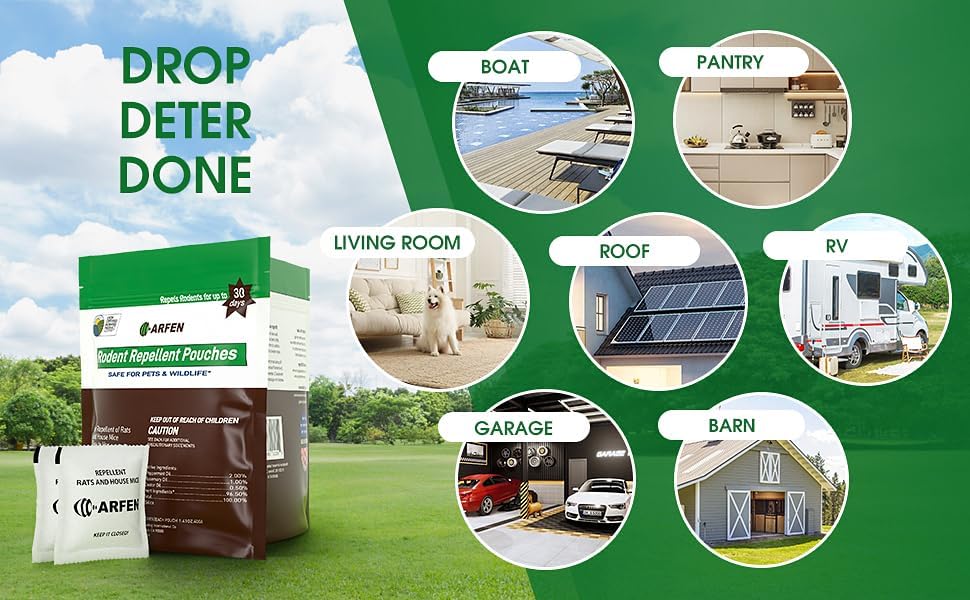 • NATURALLY DETER MICE. ARFEN rodent repellent pouch offers a sustainable alternative, effectively urging mice away from your home without causing harm. Safeguard your home, garage, car, truck, or RV with a time-released scent blend of peppermint, cinnamon, rosemary oil and castor oil. A convenient pest control barrier for any residence.