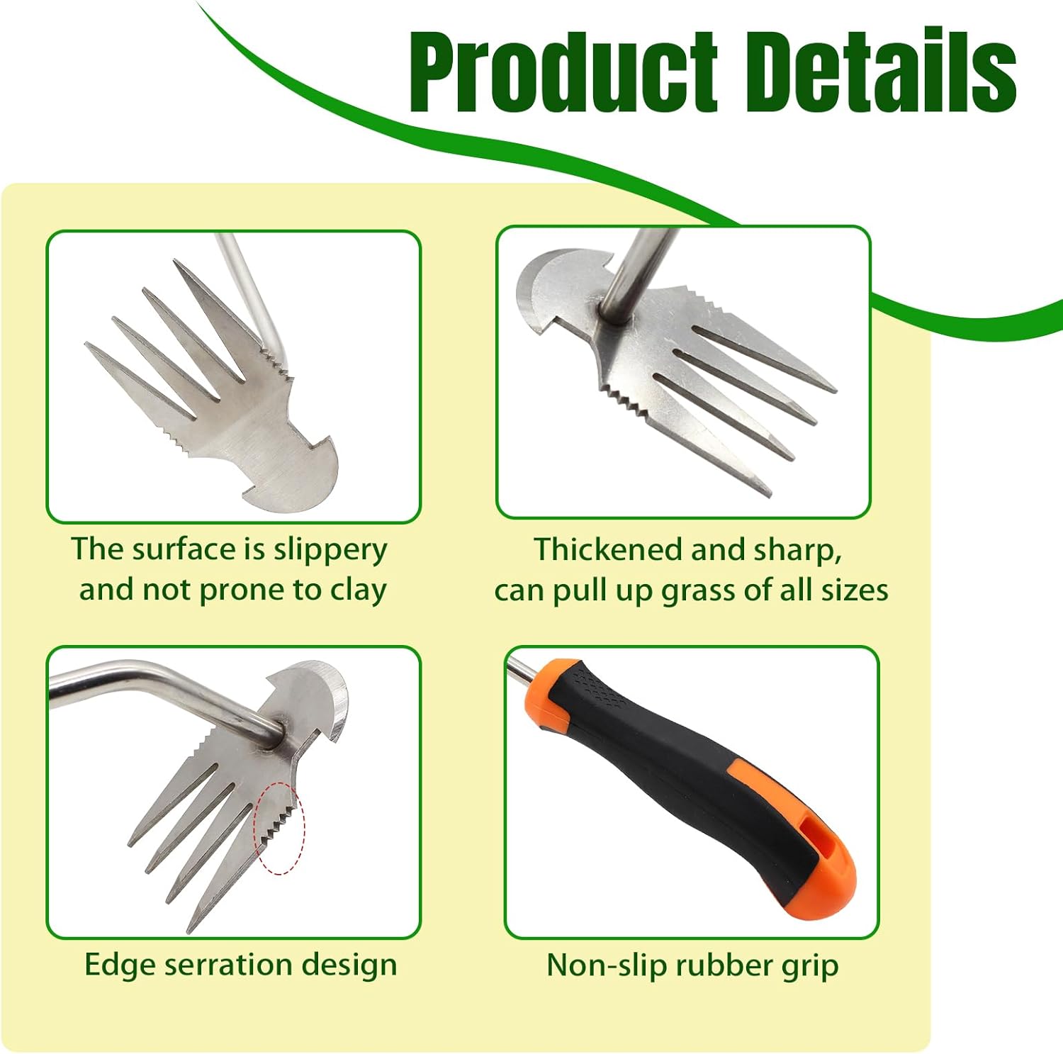 • This weeder has a unique shape that allows it to easily navigate through tight spots, so you can say goodbye to the tedious task of pulling out those pesky weeds by hand. For the material, we've chosen high-quality manganese steel to ensure it's sharp and resilient, with excellent impact and tensile strength. The precision forging technique makes it robust and durable.