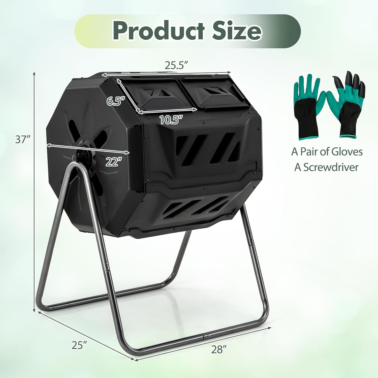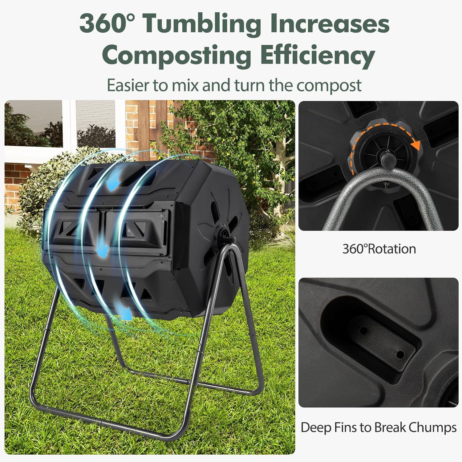 • 360° Tumbling & Aeration System: With 360° rotation design and deep fins, the dual chamber compost tumbler allows for labor-saving decomposition process. Additionally, the built-in aeration system with 16 air vents ensures optimal airflow, ensuring effective decomposition.