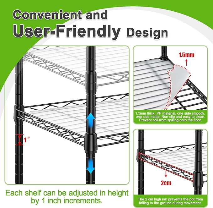 • Very Flexible Design: You can configure it as a 5-tier shelf, and each shelf's height is adjustable in one-inch increments. This adaptability allows you to accommodate plants of various sizes. If you need extra space, the shelves are removable. Removable hard plastic shelf liners line each shelf, ensuring a sturdy base for plant pots and preventing drips or debris from falling.