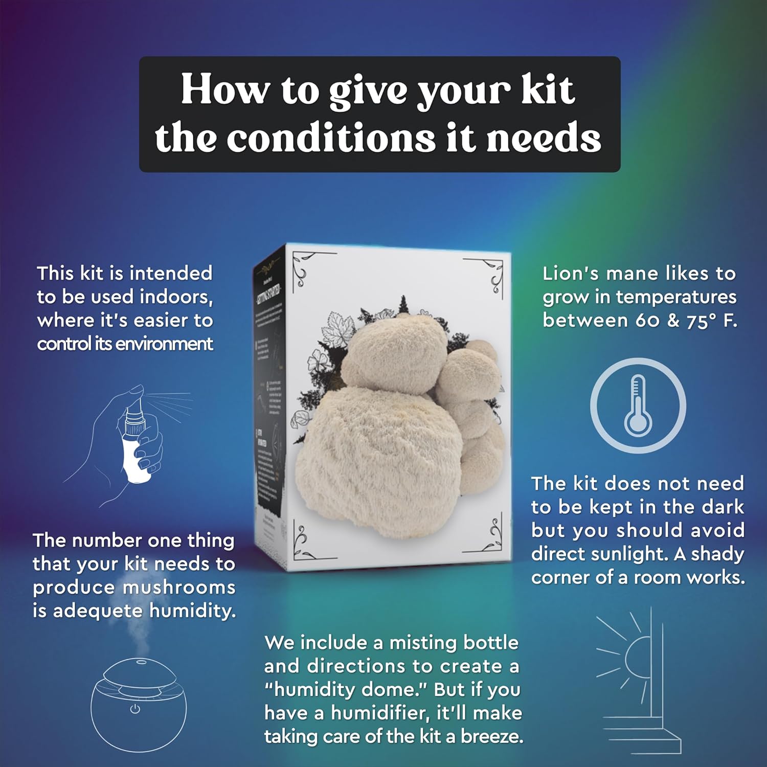 • GROW MUSHROOMS YEAR ROUND: There’s no season for mushrooms because you can grow them indoors. Just pull the circular tab off the back of this mushroom growing kit and place it in a shaded part of your home. Mist it 2-3 times every day and enjoy the first flush of lion's mane mushrooms in 10-21 days.