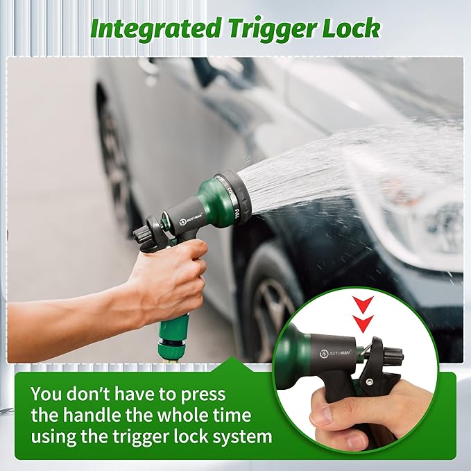 • Labor-Saving Design: AUTOMAN garden nozzle features a nice lock bar at the top of the handle that keeps the water remains on without you having to apply any pressure.Just use the lock so you don't have to keep your hand holding it the whole time.
