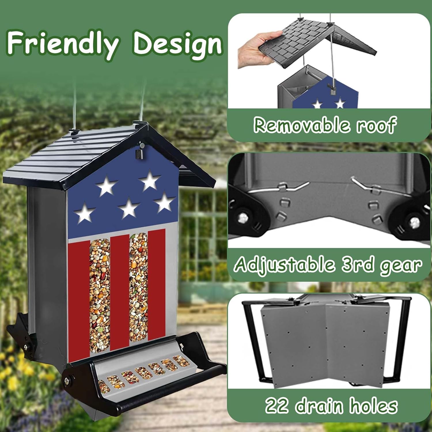 • Easy Refill & Cleaning: Squirrel proof bird feeders keep up to 5 lbs of seeds fresh and dry preventing bad seeds harmful to birds. Cardinal bird feeder with clear seed compartment lets you see when it needs to refill seeds. Easy to take up the top removable roof and refill. Regular cleaning will keep the metal bird feeder working better to attract lovely birds visiting.