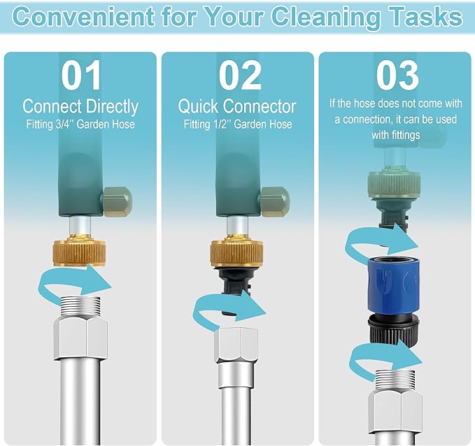 • The high-pressure hydro jet power washer wand is made to be used with garden hoses and includes 3/4” and 1/2” garden hose connectors, along with a quick connector for convenient use. There is no need to buy extra adapters, and you can easily connect.