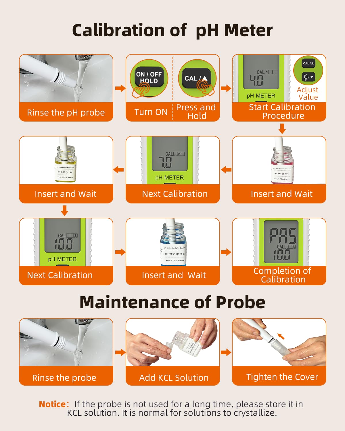• What You Get: 1 x pH Tester Meter, 1 x Manual, 1 x Handbag, 2 x batteries, 1 x brush, 1 x Protective cover, 1 x Zinc Alloy Protective Cap, 1 x pH 4. 01 Calibration solution,1 x pH 7. 00 Calibration solution,1 x pH 10. 01 Calibration solution, 1 x KCL solution