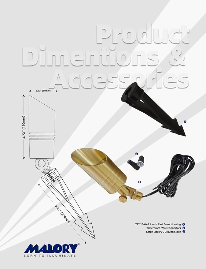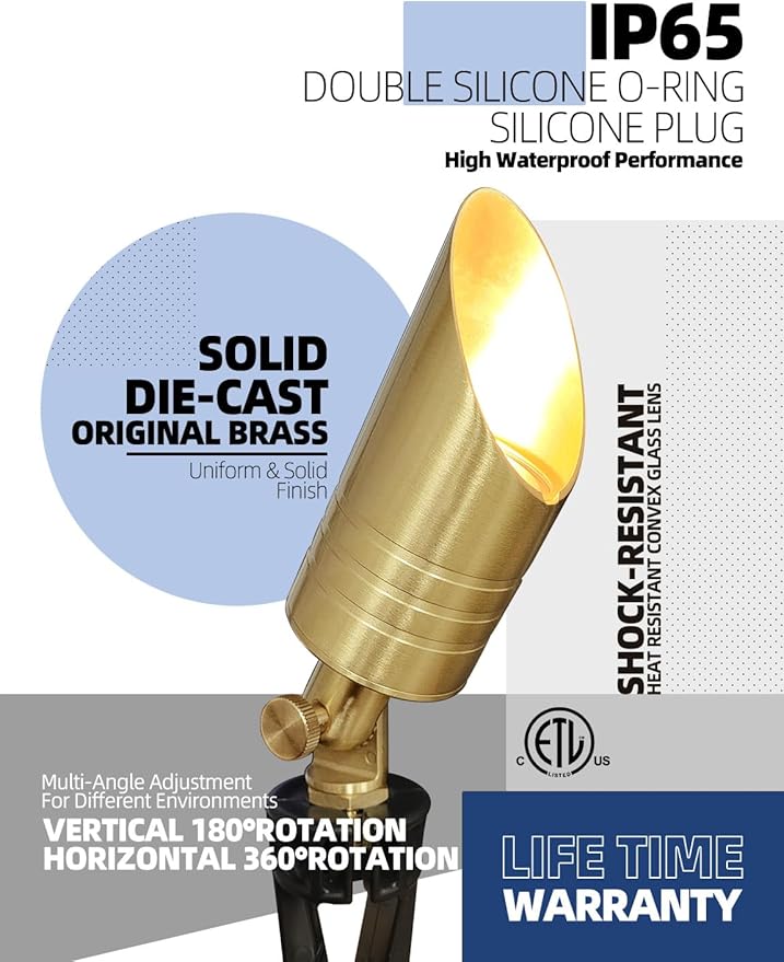 • BRASS LIGHT FIXTURE:MALORY landscape spotlight is constructed of die-cast brass for durability and beauty.Brass spot light doesn't corrode,more durable and reliable than aluminum and plastic fixtures,ideal for any uplighting application.Simple design structure for the light fixture make it looks beautiful yet unobtrusive in any landscape,suitable for decorating most houses and yards.