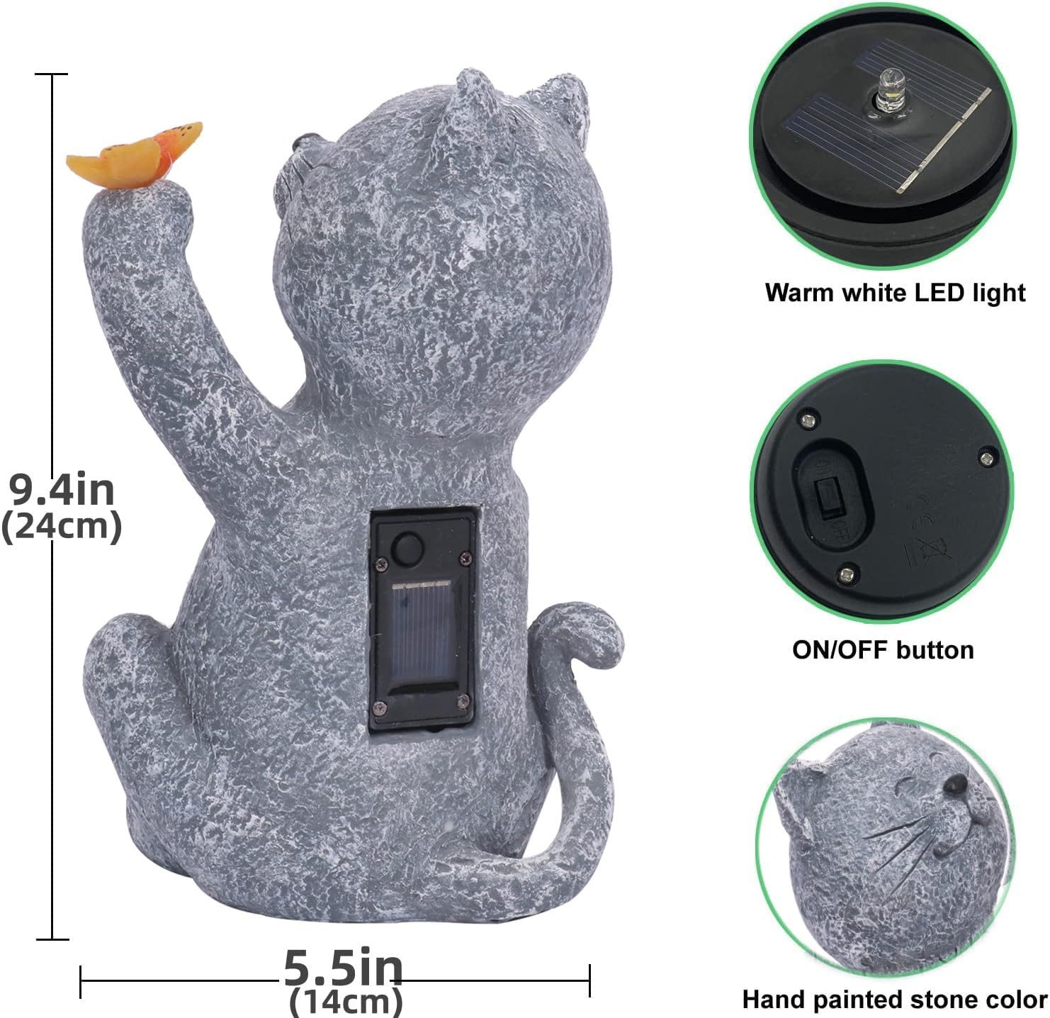 Solar Garden Statue Cat Garden Figurines Cat Garden Statue Outdoor Decor, Solar Powered Resin Sculpture with Butterfly Light Art Decoration for Patio Lawn Yard Porch, Housewarming Garden Gift
