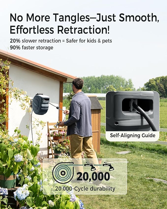 - 20,000-Cycle Self-Winding System: Industrial-grade alloy spring ensures consistent retraction force. The self-winding hose reel retracts 20% slower to prevent whipping hazards while achieving 90% faster storage with smooth, tangle-free operation