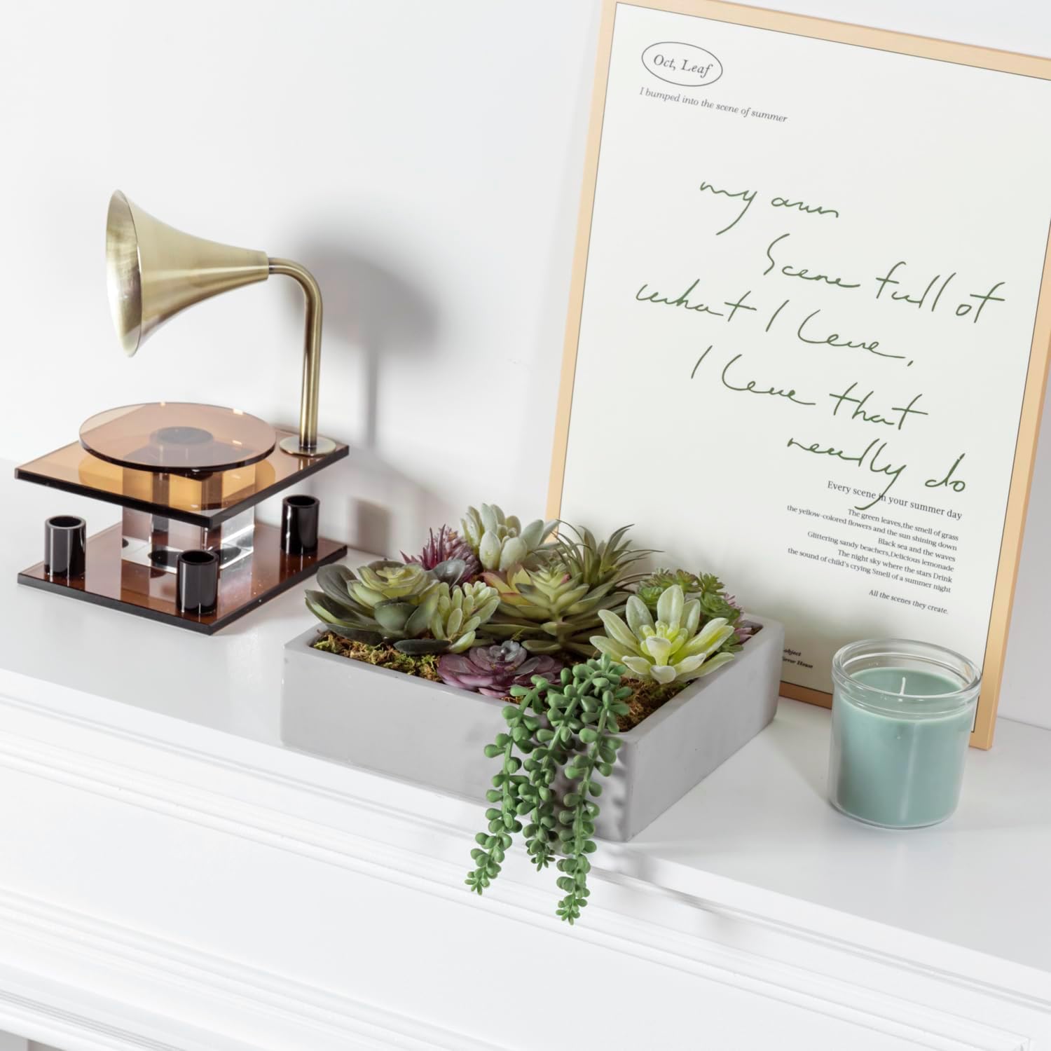 • Assorted faux mini succulents and trailing string of pearls potted in an 8-inch square gray concrete container for an aesthetic indoor tabletop decoration