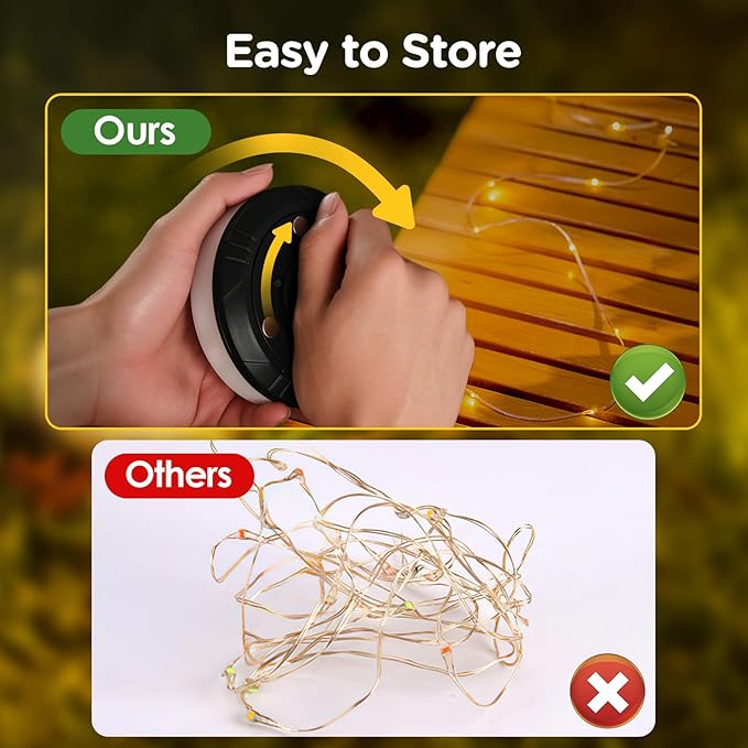 • Portable Storage: The camping light is only 7.4 ounces, very lightweight and portable, it can be easily put into a backpack or handheld device, a quick turn of the handle and the manual device ,32.8FT string lights can resume the camping light in only 30 seconds. The clever design of the string lights for camping ensures portable storage. Undoubtedly a camping essentials.