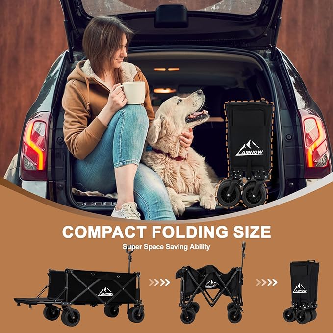 • Upgrade Large Capacity Easy To Carry: AMNOW utility wagon with unfold full size: 52"*22"*38", really has deeper and larger storage space far exceed other collapsible wagon, To stop worrying about what to go out with. compact folding design the outdoor wagon cart folds into a small size(14.6"*10.6"*29.9"), allowing for effortless storage in your car trunk