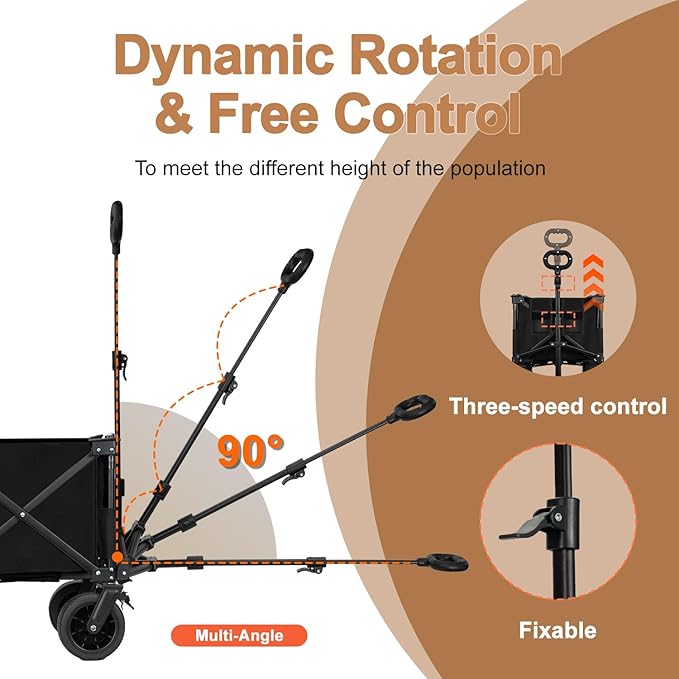 • Folding Wagon Cart-Flexible Maneuverability: The portable wagon is equipped with 360°swivel wheels and brakes for stability on slopes, You can go wherever you want to go, no matter how difficult the terrain is. The telescoping handle can be adjusted at any Angle, Accommodates people of different sizes, Even if your child wants to pull it, it's very easy