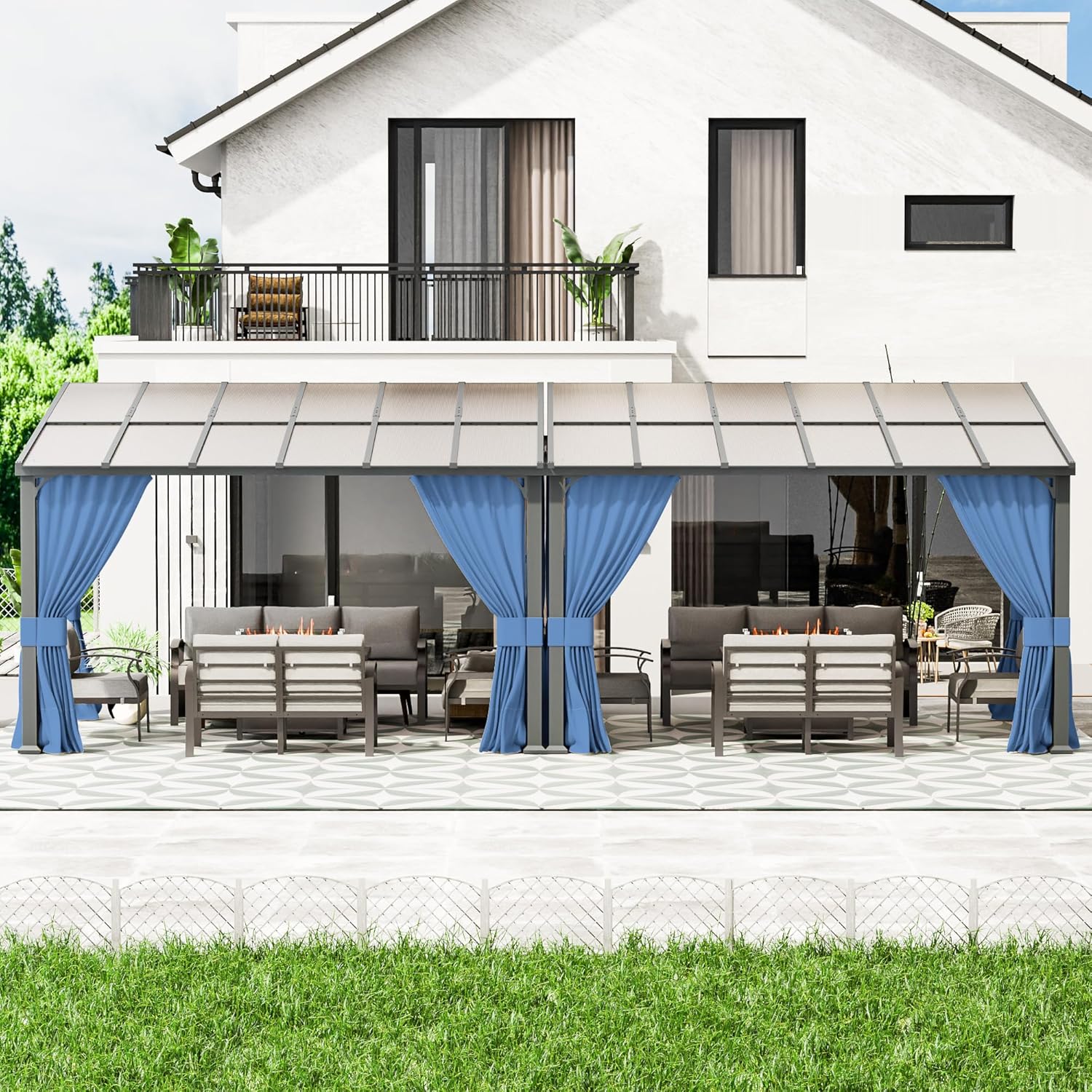 • SUNSHINE BOARD: The top of the hard top lean to gazebo is made of semi-transparent teal-colored sunshine board, which is hard and highly resistant to rain and snow, and also has some light transmission properties. It is UV resistant. In sunny weather, you can enjoy the warm sunshine under the gazebo without getting sunburned. The teal colored sun panel will look very nice under the sunlight.